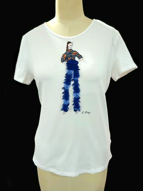 cotton spandex white tee with sequin jacket and shades of blue ruffled pant.