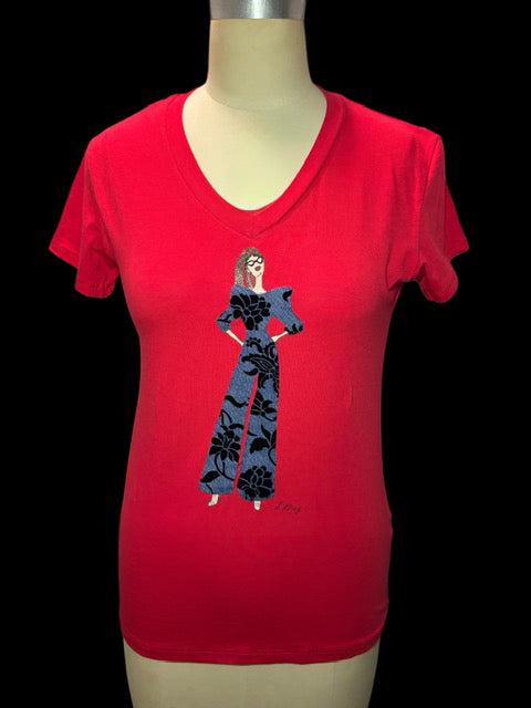 Turn heads and uplift hearts in this vibrant red V-neck tee featuring a confident SGC fashion figure with beautifully braided hair and fierce cat-eye glasses. She’s rocking flocked denim palazzo pants and an oversized shirt with effortless flair. Soft, stretchable cotton hugs in all the right places—long, fitted, and full of personality.