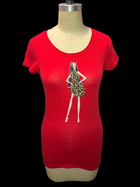 Command attention in the Boss Beauty Tee from the Sheila Gray Collection. This bold red 3D textural fitted tee (size large) features a striking fashion figure with sleek black hair, a statement red lip, and a flutter of a single long eyelash. Dressed in a fabulous four-tier leopard halter dress, and posed with her hands confidently on her hips—she’s giving main character energy all day.