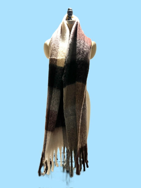 Shade of brown and beige acrylic yarn scarf cozy and wide.