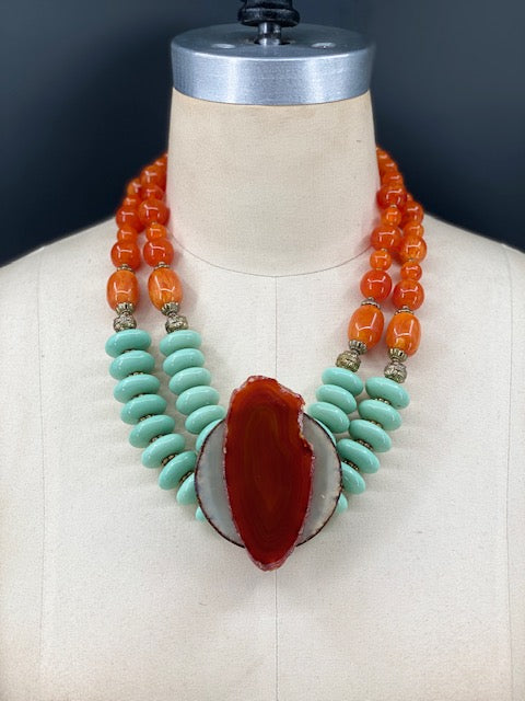 Marbleized orange beads are painted with turquoise flat beads and accented with ivory coconut button and Mahogany glass gem etched in chipped wood.