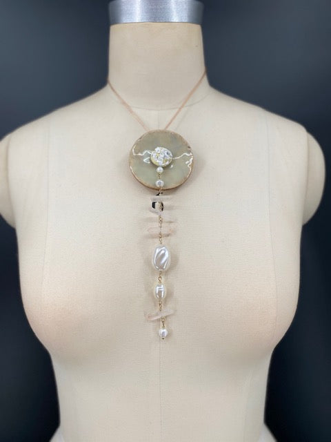 Ivory coconut enameled casing with marbled with beads encase a string of pearl and glass dangling beads