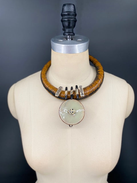 Two-toned mahogany and black vegan leather necklace with coconut glazed enamel medallion and marbled bead accent. With black and beige horns and domino etched sketching attached.