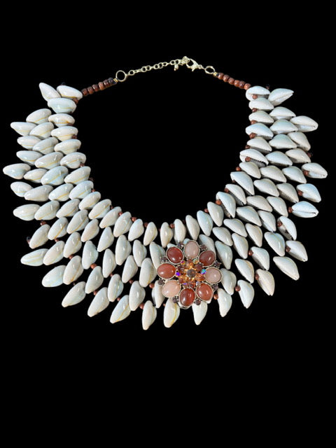 Elevate your look with the one-of-a-kind SGC Island Grace Bib Necklace, where earthy elegance meets timeless artistry. This stunning statement piece features cascading clusters of natural cowrie shells, rich wooden beads, and a striking marble-like brooch centerpiece. Swirled in tones of topaz, bronze, amber, and soft peach, the center radiates warmth and grounded beauty. Finished with a silver chain clasp closure, this bib necklace is both bold and deeply soulful—perfect for the woman who carries grace, heritage, and strength wherever she goes.
