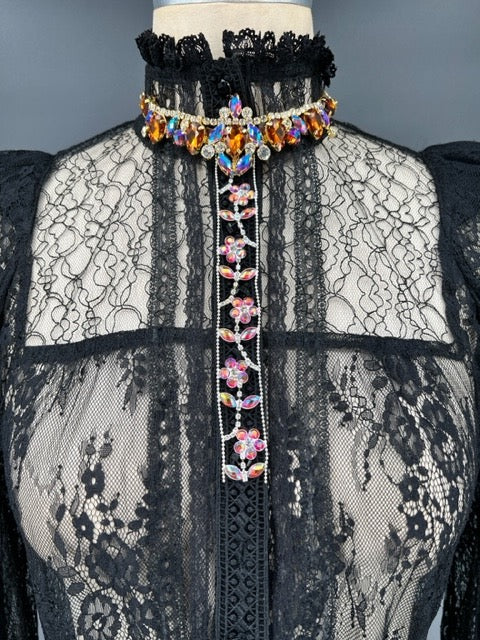 Mahogany brown stones surround metallic rhinestone dangling flowers