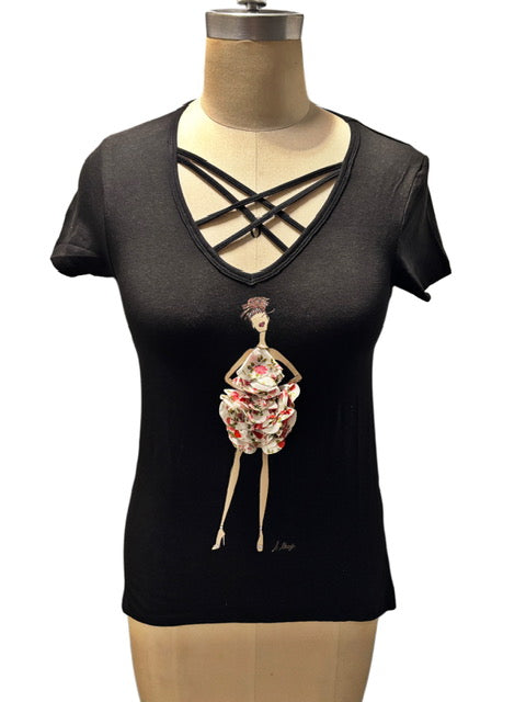 Turn heads in the Golden Bloom Grace Tee from the Sheila Gray Collection. This black 3D textural tee features a stylish open crisscross front detail, scoop neckline, and a flattering hi-low hem—short in the front, flowing longer in the back. Adorned with a striking fashion figure rocking elegant twists and a layered floral halter dress, accented with a delicate gold seed bead chain, this tee is wearable art in motion. Size Medium. Wash on delicate and lay flat to dry.