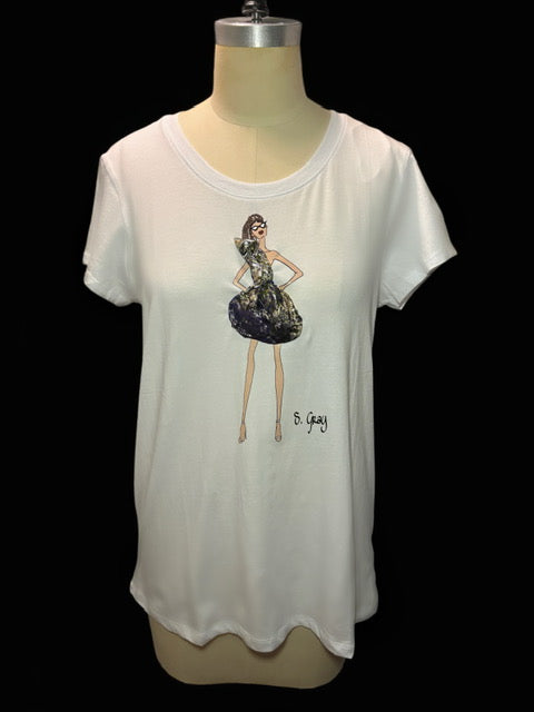 Step into your power and your softness with the Golden Gaze Goddess Tee. This 2X crew neck cotton tee is long, loose-fitting, and made to move with grace and style. Featuring a stunning SGC fashion figure adorned in a flowing metallic gold and navy chiffon puff gown, braided hair, and fierce cat-eye sunglasses—she’s elegance with edge. The 3D texture brings her to life, making this more than a shirt—it’s wearable art with soul. Short sleeve and breathable, it’s perfect for dressing up or down. Machine washable on delicate, lay flat to dry. Style her your way and shine like the goddess you are.