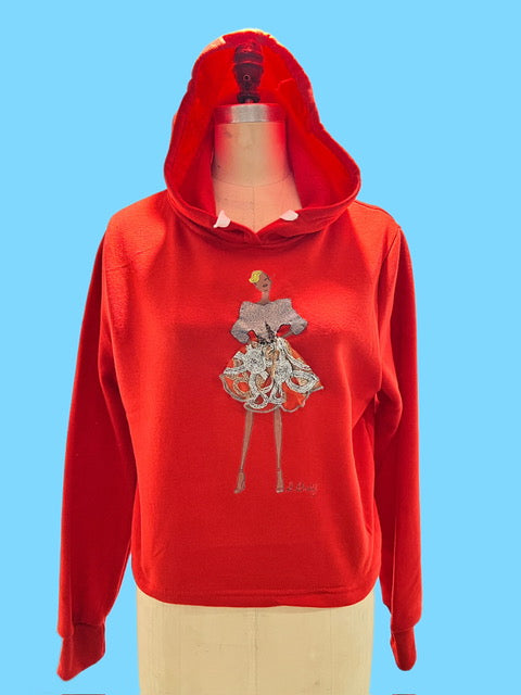 Fire Red Soft Cozy Cotton Hoodie with white drawstring tucked inside. Hoop fabric sheer metallic skirt and bronze fabric top. Adorned with blonde gray girl figure.