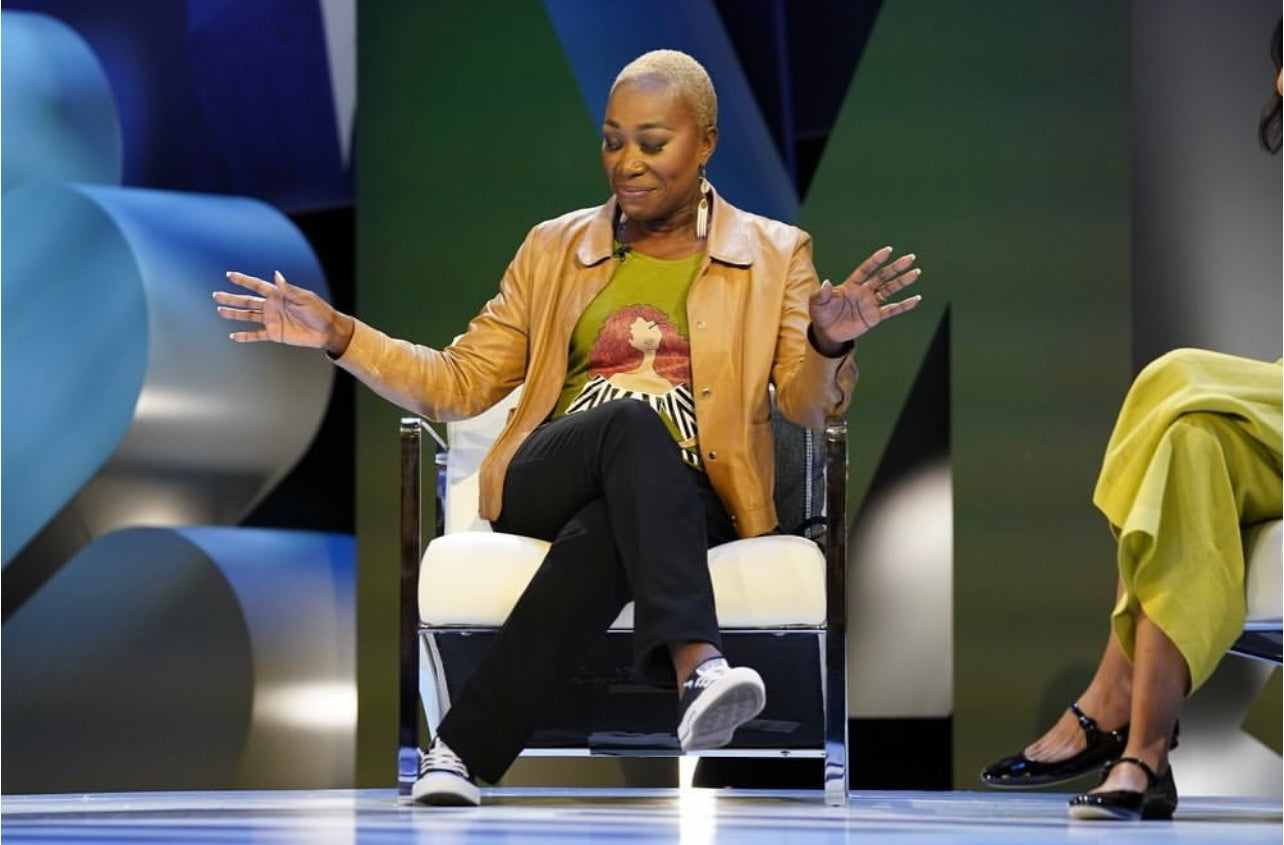 Joy Reid wearing Sheila Gray Collection X Ashley Stewart Collaboration Tee
