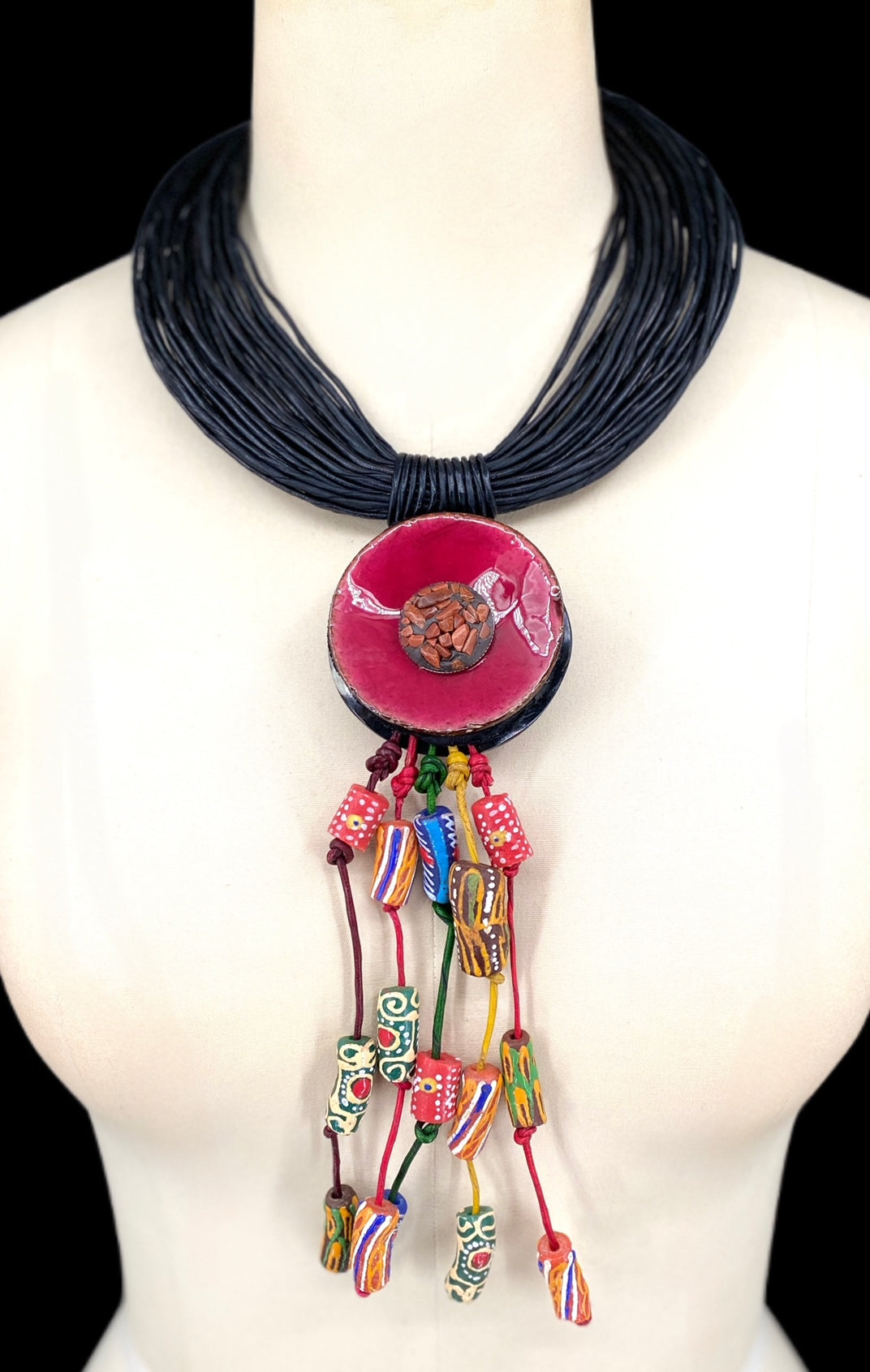 black strands faux leather with red Coconut enamel medallion center encased with button and copper marble accent and Koi painted multi-colored strands