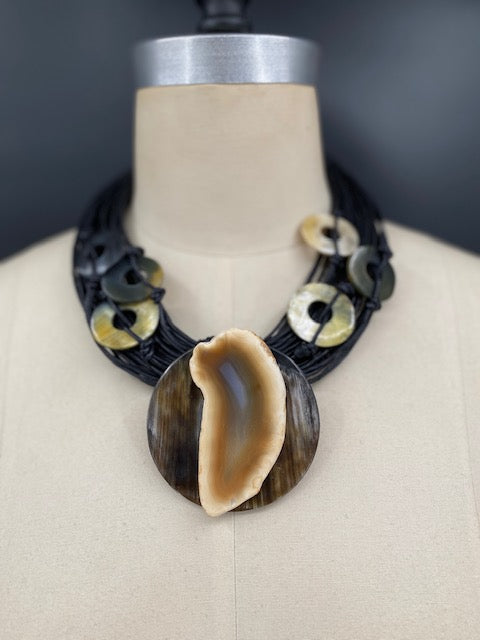 Vegan leather wraps around gem with marble circles encased black, brown and maghogany