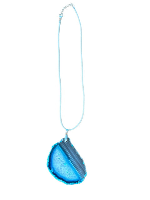 Blue oceans and stripes agate marbleized stone necklace with white and silver cord and chain.