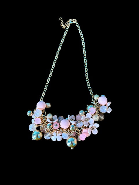 Pearl and pink pearl with gold and clear cluster of beads in gold chain mixture.