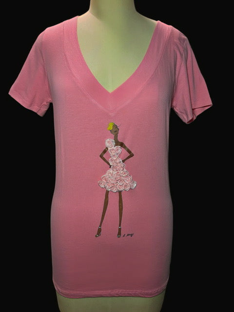 Step into your softness and slay in florals with the SGC "Rosé All Day Beauty" Tee — where confidence meets couture charm. This 3D textural mauve V-neck tee features a short-sleeved cotton stretch fit in XL that hugs just right. The star? A stunning blonde fashion figure in a pink rose fit-and-flare dress that celebrates every curve with her hourglass glow. She’s flirty, feminine, and full of grace—just like you.