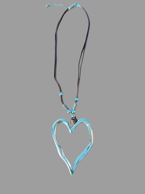 Silver and antique gold rustic mix heart necklace with silver beads and faux brown leather corded chain with silver clasp closure.