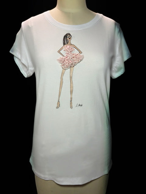 Turn heads and tell your story in the “Sass & Dots” T-shirt from the Sheila Gray Collection. This XL white cotton crew neck tee features a signature 3D textural fashion figure with braided hair, oversized black glasses, and full-on attitude. She’s styled in a white and red polka dot bustier dress that pops with playful sass and vintage charm.