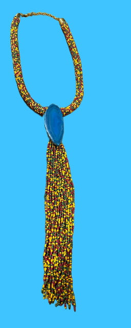 Multi colored seed bead drop necklace accented with ice blue agate stone.
