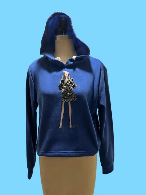 Navy Blue Cozy Soft Cotton Hoodie with white drawstring tucked inside. With Zebra print fabric puffer wide sleeve fabric top and metallic lace fabric skirt.