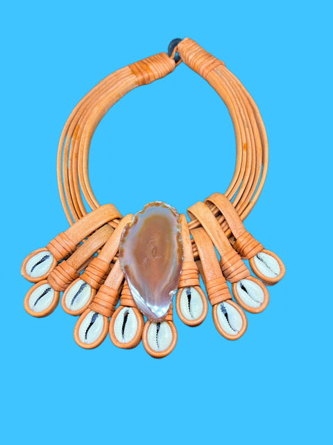Tangerine Leather Corded necklace with leather loops and cowrie accents topped off with marbleized Mahogany agate center stone.
