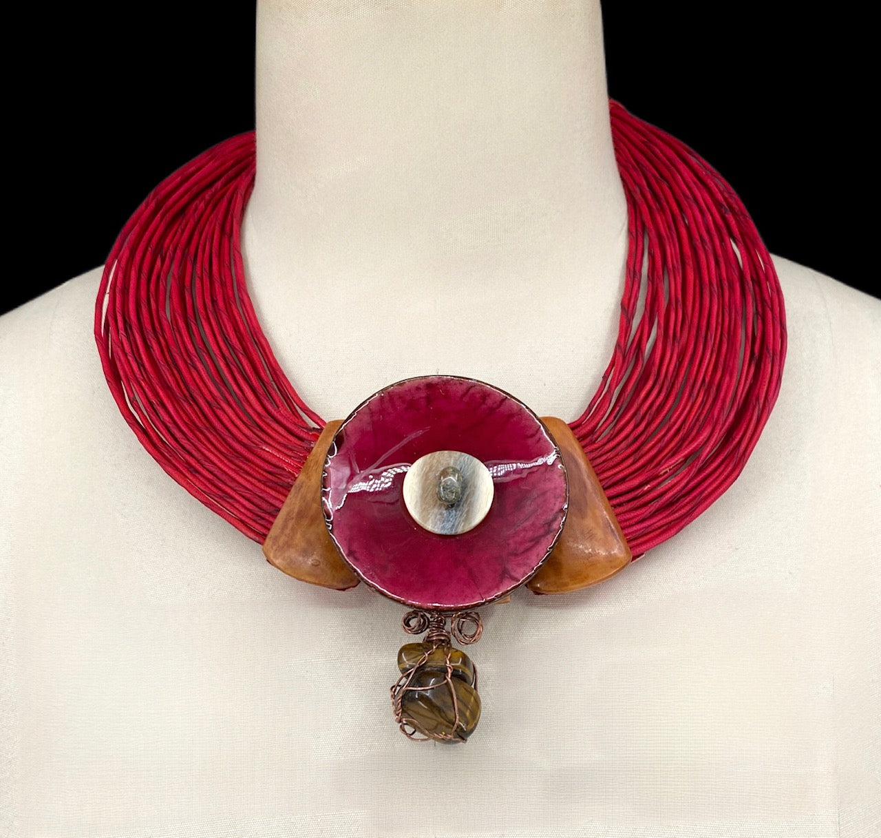 Marbled Red faux leather cords with red coconut etched medallion with wire