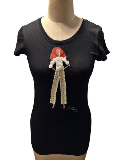 Step into a swirl of self-expression with our White Wonderland Swirl Tee—a bold, beautiful tribute to style, soul, and individuality. This black crew neck tee (Size L) features a striking SGC fashion figure adorned with voluminous red curls, exuding confidence and fire. She rocks ivory white shag denim pants detailed with shimmering silver studs—radiating grace, strength, and fearless beauty.