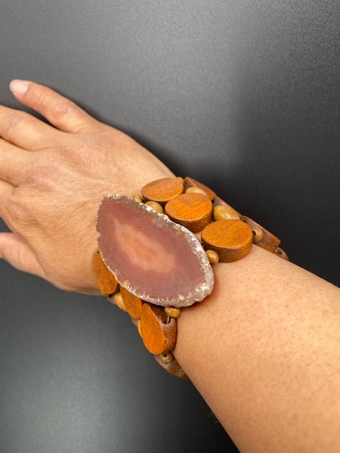 Wooden Circle and Beaded Stretch Cuff with Agate